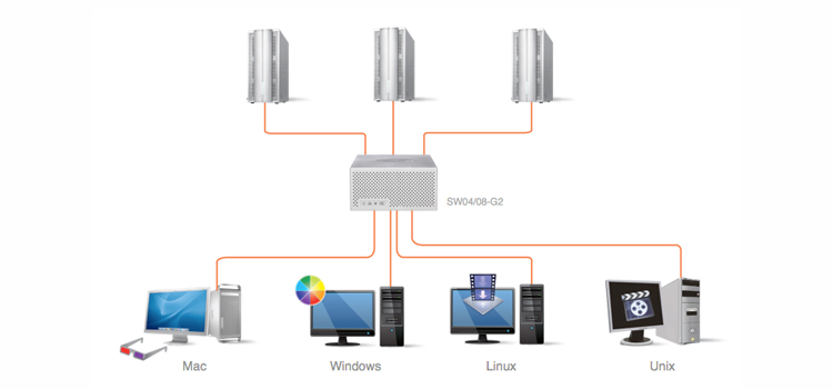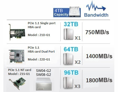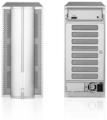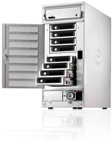 | A08S-PSは8台までの 3Gb SAS/SATA II ハードディスクを搭載できます。A08S-PSの最大容量は4 TBのハードディスクを8台搭載した場合32TBととなります。ハードディスモジュールはホットブラグに対応しており、RAID5, 6の環境下では、コンピュータをシャットダウンせずに新しいハードディスクに交換することが可能です。 |