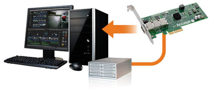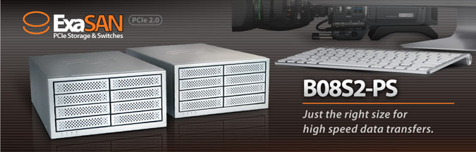 また、別売りのPCIe 2.0 ExaSANスイッチに接続すればモバイルSANを構築することができます。クライアントワークステーションをスイッチにつなぎ、SANitファイルシステムのようなSAN管理ソフトウェアを使ってメディアファイルを共有することができます。また、必要に応じて、記憶容量を増やすために追加のRAIDシステムをスイッチに接続することができます。 |