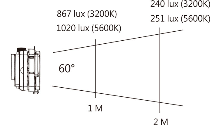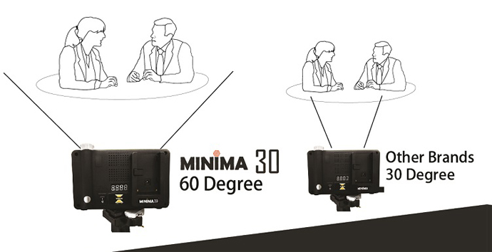 広い照射角度:MINIMA30の照射角は60°です。 物撮りはもちろん、インタビューなどの際の補助照明としても最適です。