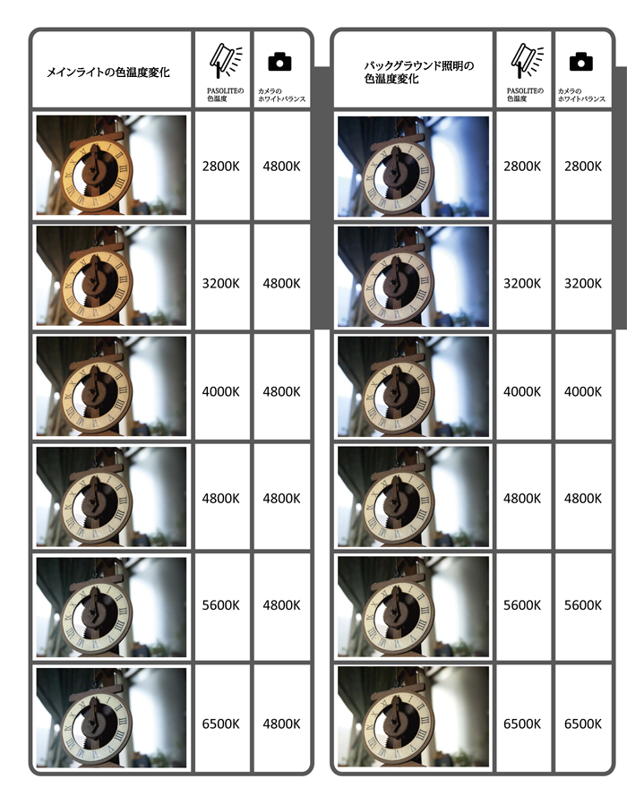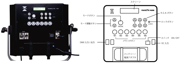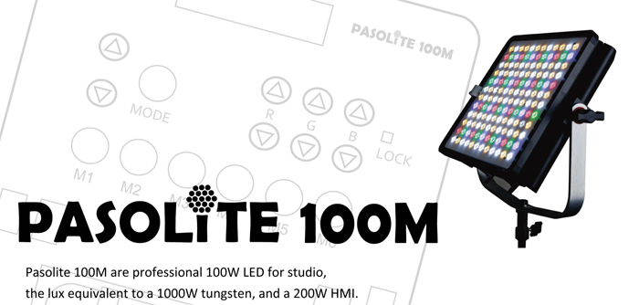 概要 PSOLITE 100Mは低消費電力・高輝度のLEDを25kHzのWPMコントローラとデジタル・シグナル・ プロセッサでコントロールすることによりフィルタの交換なしでCRI 90%以上の6種類の色温度の光を (2800K/ 3200K/ 4000K/ 4800K/ 5600K/ 6500K)ボタン操作だけで切り替えて照射できます。 高輝度のLEDを使用しているので、低消費電力でありながら、1000Wのタングステンライトに相当する光量があります。